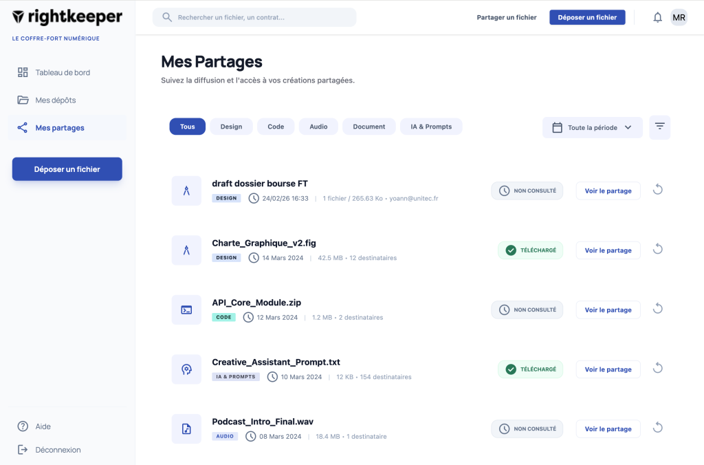 Recevez un certificat de propriété conforme, prêt à être utilisés en cas de litige ou pour vos contrats.